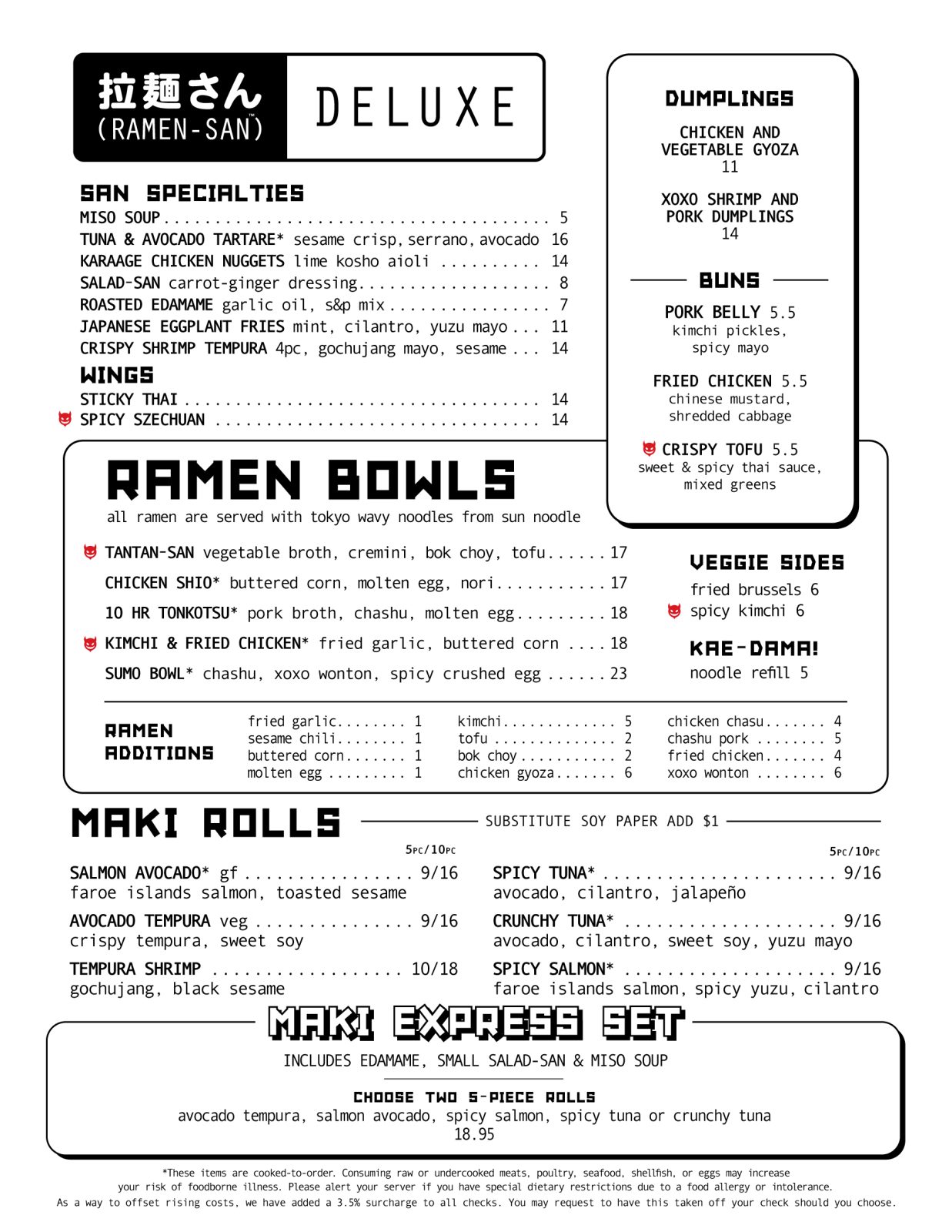*consuming raw or undercooked meats, poultry, seafood, shellfish or eggs may increase your risk of foodborne illness. | As a way to offset rising costs, we have added a 3.5% surcharge to all checks. You may request to have this taken off your check should you choose.